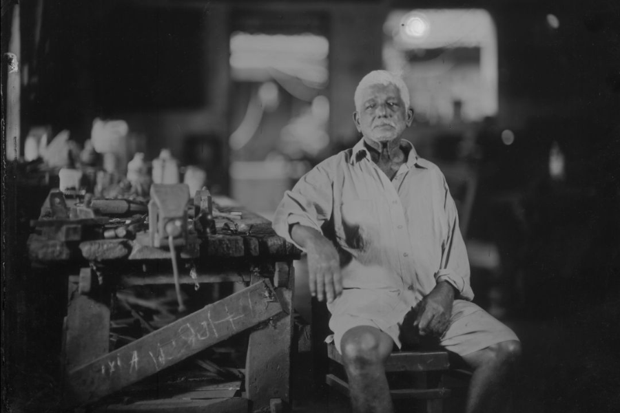Even today, the Waddo is a place suspended in time practically unchanged from the past, where a long standing tradition of woodcraft continues to survive through a bloodline of artisans. Stretched along a serene lake-khazaan, the village soundscape is eternally humming with the soft rhythm of hand planers, chisels and occasional machine tools echoing from the workshops that adjoin almost every home. Using the historic wet-plate-collodion process—a slow and demanding photographic method from 1851—this work seeks to mirror the history of the Chari as a portraiture of their unbroken lineage and continued legacy. From 2021 to 2023, Mrinal Bahukhandi learnt the basics of woodworking in Chari Waddo from members of the community.