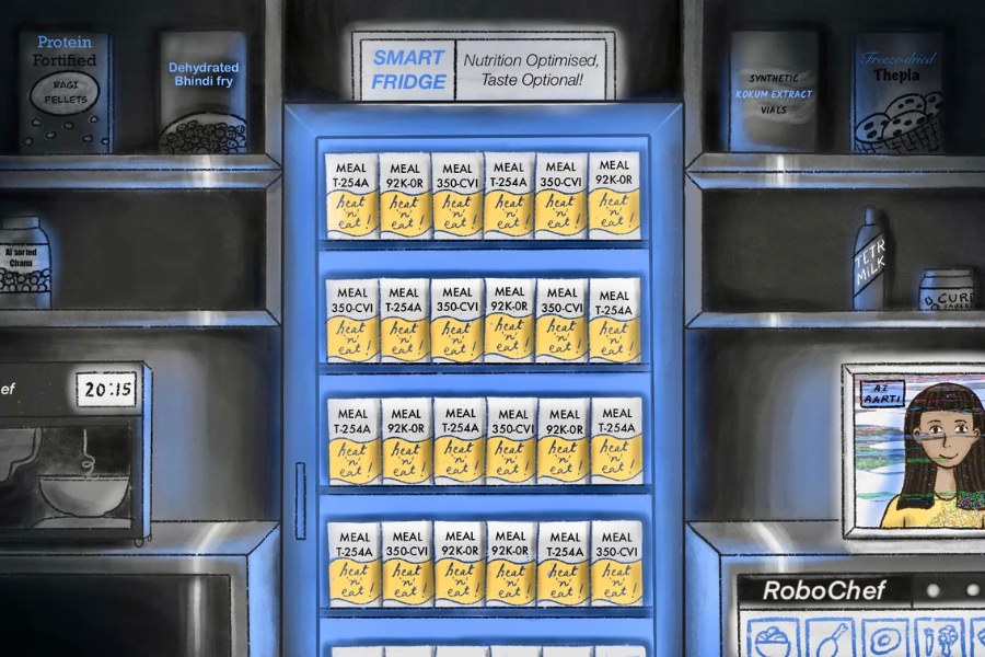 From a kitchen where hardly anything is cooked to a kirana store lined with synthetically constituted food, each room hums with the quiet absence of heirloom ingredients, traditional recipes, everyday rituals, and food stories once passed down by hand and heart. Visitors are invited to encounter this loss not through spectacle, but through intimacy. Projected memory fragments, hollow ceremonial meals, and a final staircase that reignites hope trace a speculative yet emotionally grounded journey through grief, longing, and tender resistance. This is not dystopia. It is a near-future mirror—close enough to feel real, urgent, and entirely possible.